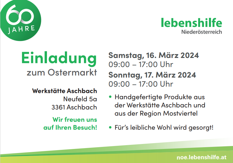 Auch heuer lädt die Werkstätte Aschbach herzlich zu ihrem traditionellen Ostermarkt ein!